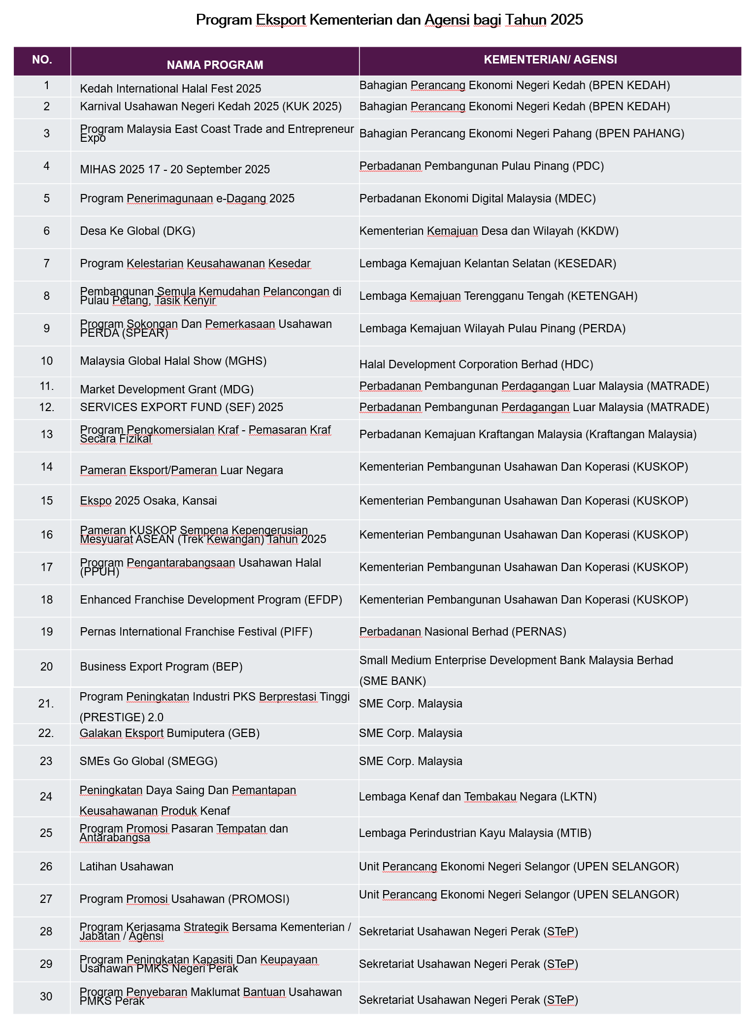 Pelbagai inisiatif dan program sokongan disediakan untuk meningkatkan eksport di kalangan pengeksport PKS di Malaysia. Misalnya, MATRADE sebagai agensi promosi eksport Malaysia menawarkan pelbagai program pembangunan pengeksport dan mengatur aktiviti promosi eksport untuk syarikat Malaysia. Agensi di bawah Kementerian Perdagangan Antarabangsa dan Industri (MITI) bekerjasama dengan agensi lain seperti Lembaga Pembangunan Pelaburan Malaysia (MIDA), SME Corp. Malaysia dan SME Bank untuk melaksanakan inisiatifnya. Tambahan pula, terdapat agensi-agensi terkemuka yang menyediakan inisiatif eksport untuk PKS dalam industri dan sektor tertentu seperti (rujuk jadual di bawah):